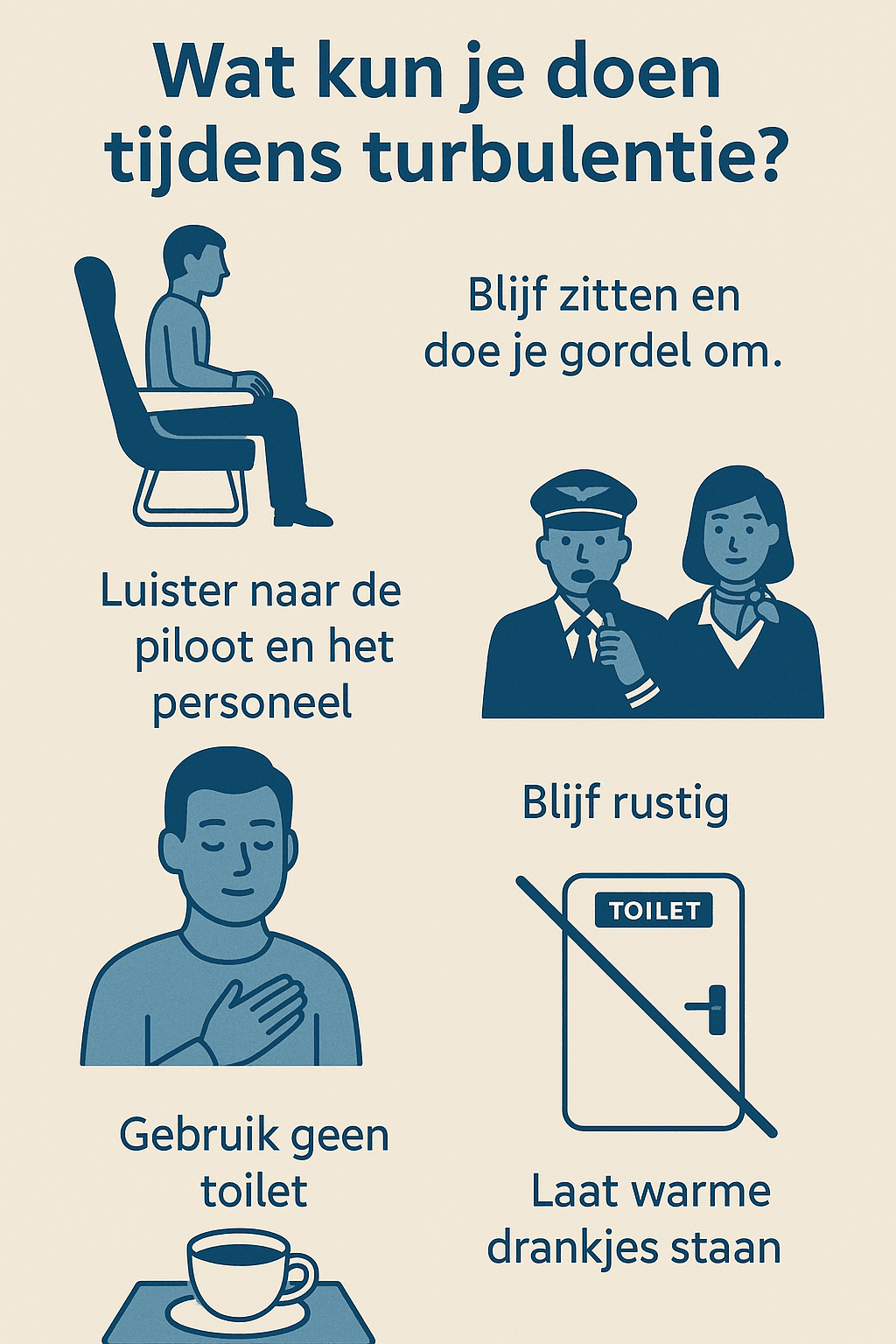 Als er turbulentie is, mag je niet opstaan om naar het toilet te gaan. Wacht tot het weer rustig is.